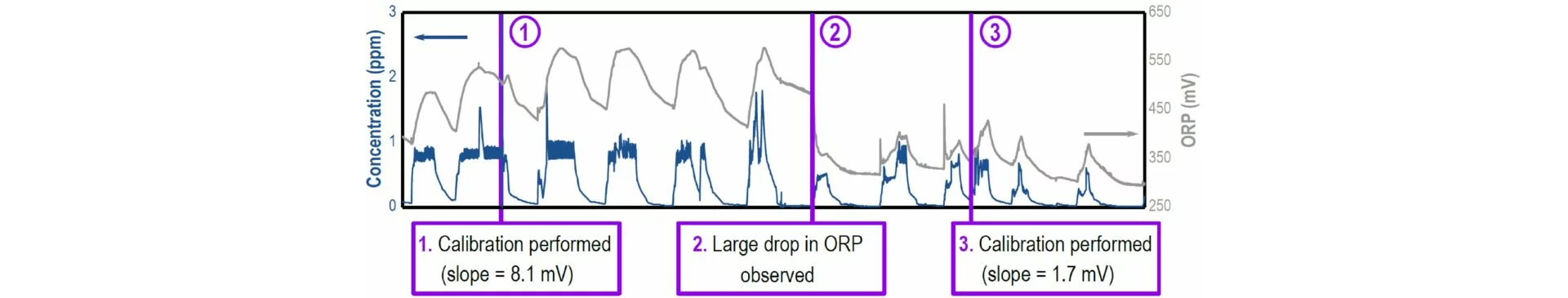 By interpreting the differences in the calibration slopes and the large drop in ORP, the Kuntze support team advised the tower operators to look for any external anomalies which could have changed the tower’s chemistry.