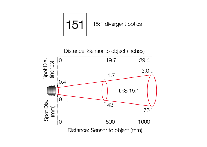 The diagram shows the measured spot size for 90% of the detected energy. Sensors can measure longer distances than